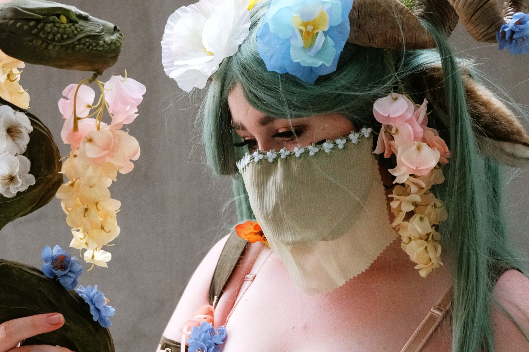 The cape and staff were quite a true collaboration. We planned out how to distribute the weight of the many flowers on her cape by adding an invisible interlining of tuule to allow the fashion fabric to avoid the strain, and added some hefty snaps to attach it to my stays so there were no visible straps. The staff is actually the same staff that I used in my Keyleth cosplay back in the 2019 Cosplayer Annual! We gave it a new life by wrapping it in armature wire, aluminum foil, plaster, and finally foam clay for all the detail work. My sister gets all the credit for the amazing snake heads, however. She did a fantastic job bringing life to those little friends.